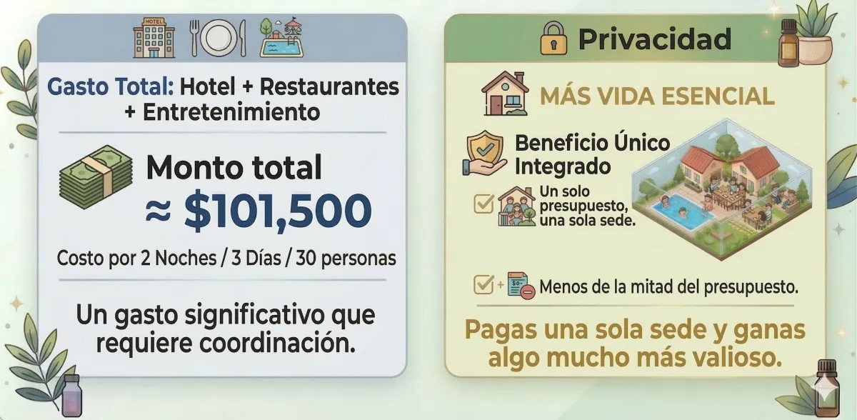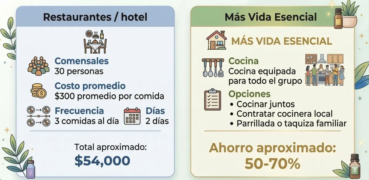 | Comidas (3 al día) | $300 × 3 comidas × 30 personas × 2 días = $54,000 | Cocina equipada o cocinera local (ahorro 50–70%) |