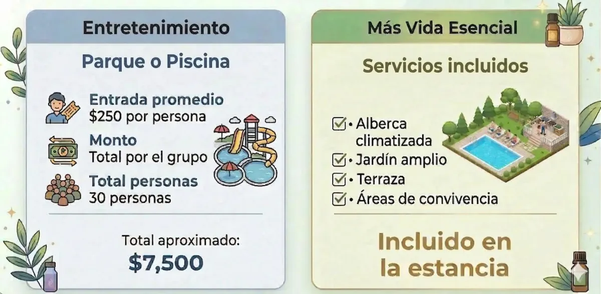 | Entretenimiento | Balneario $250 × 30 | ✅ Alberca y jardín incluidos |